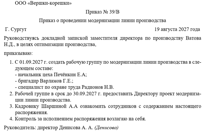 Бланк приказа директора о проведении модернизации линии производства