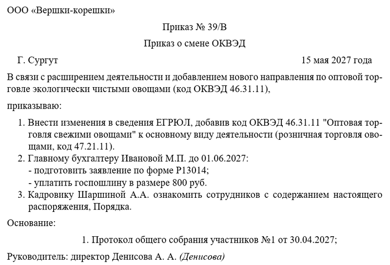 Приказ директора о смене ОКВЭД выполняет несколько важных функций: фиксирует перечень новых кодов деятельности, назначает ответственных за подготовку документов и устанавливает сроки внесения изменений. В приказе указываются причины корректировки и предполагаемые последствия для бизнес-процессов компании. Документ служит основанием для обращения в налоговые органы и внесения соответствующих изменений в локальные нормативные акты предприятия.