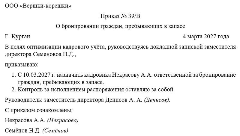 - с такого-то числа назначить такого-то сотрудника ответственным за бронирование пребывающих в запасе работников;