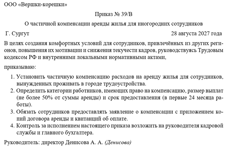 Бланк приказа о частичной компенсации аренды жилья для иногородних сотрудников