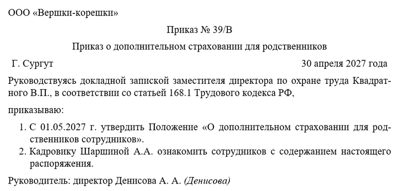 Скачать в КонсультантПлюсБесплатный доступ к документуОбразец приказа о дополнительном страховании для родственников