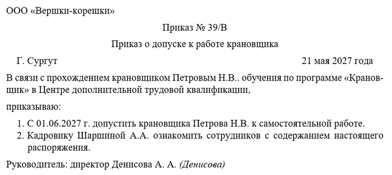 Следующим шагом руководитель объявляет о допуске крановщика из штата своей организации к самостоятельной работе. Также необходимо решить вопрос о том, кто их работников будет следить за исполнением распоряжения. Не забудем назначить одного из сотрудников ответственным за ознакомлением с новым регламентом всех коллег. Это может быть руководитель отдела или целого направления, заместитель директора. Чаще всего контроль за исполнением распоряжения директор оставляет за собой.