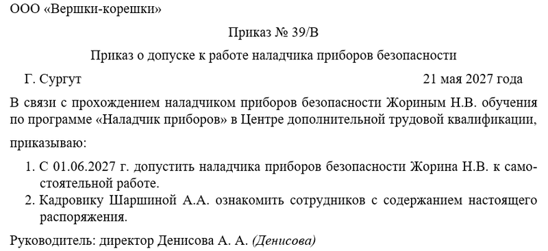 Следующим шагом руководитель объявляет о допуске к самостоятельной работе наладчика приборов безопасности после прохождения им соответствующего обучения в образовательном заведении. Также необходимо решить вопрос о том, кто их работников будет следить за исполнением распоряжения. Не забудем назначить одного из сотрудников ответственным за ознакомлением с новым регламентом всех коллег. Это может быть руководитель отдела или целого направления, заместитель директора. Чаще всего контроль за исполнением распоряжения директор оставляет за собой.