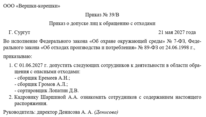 Следующим шагом руководитель объявляет о допуске сотрудников компании к обращению с отходами. Также необходимо решить вопрос о том, кто их работников будет следить за исполнением распоряжения. Не забудем назначить одного из сотрудников ответственным за ознакомлением с новым регламентом всех коллег. Это может быть руководитель отдела или целого направления, заместитель директора. Чаще всего контроль за исполнением распоряжения директор оставляет за собой.