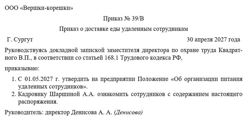 Следующим шагом руководитель объявляет об утверждении Положения «О доставке еды удаленным сотрудникам». Также необходимо решить вопрос о том, кто их работников будет следить за исполнением распоряжения. Чаще всего контроль за исполнением распоряжения директор оставляет за собой.