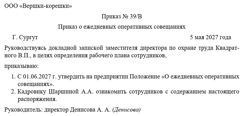 Следующим шагом руководитель объявляет о проведении ежедневных оперативных совещаний, утверждает соответствующий регламент. Также необходимо решить вопрос о том, кто их работников будет следить за исполнением распоряжения. Чаще всего контроль за исполнением распоряжения директор оставляет за собой.