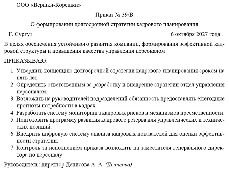 Приказ о формировании долгосрочной стратегии кадрового планирования оформляется в официально-деловом стиле и должен содержать четкую структуру: преамбулу с обоснованием, нумерованные пункты распоряжений, закрепление ответственности и указание лица, осуществляющего контроль. Документ оформляется на фирменном бланке, содержит дату, регистрационный номер и подпись руководителя.