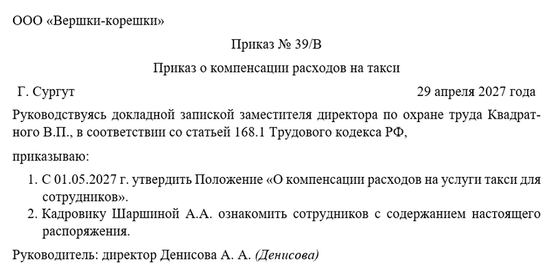 Следующим шагом руководитель объявляет о компенсации расходов работников, понесенных им на оплату услуг перевозки пассажиров, то есть такси. Вероятнее всего, речь пойдёт об утверждении соответствующего положения, локального акта. Также необходимо решить вопрос о том, кто их работников будет следить за исполнением распоряжения. Чаще всего контроль за исполнением распоряжения директор оставляет за собой.