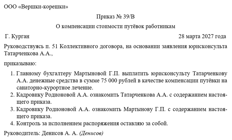 Следующим шагом руководитель объявляет о выплате компенсации стоимости путёвок работникам, раздает подчинённым соответствующе распоряжения, возлагает ответственность за исполнение приказа, а также назначает человека, который будет осуществлять контроль. Чаще всего контроль за исполнением распоряжения директор оставляет за собой.