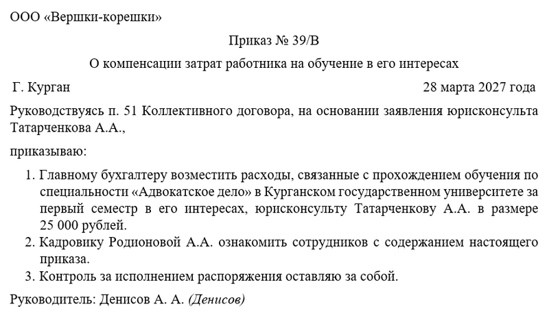 Следующим шагом руководитель объявляет о выплате компенсации затрат работника на прохождения обучения в его интересах, раздает подчинённым соответствующе распоряжения, возлагает ответственность за исполнение приказа, а также назначает человека, который будет осуществлять контроль. Чаще всего контроль за исполнением распоряжения директор оставляет за собой.