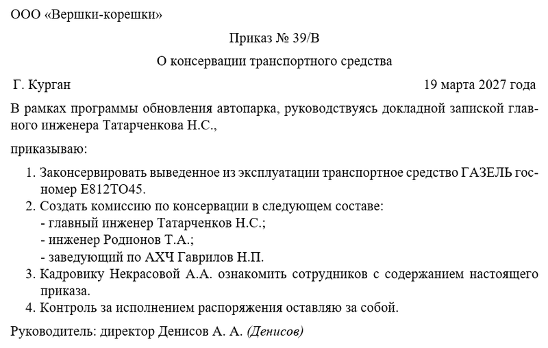 Приказ директора о консервации транспортного средства – это распорядительный документ, в соответствии с которым директор организации может принять решение о выведении транспортного средства из эксплуатации и его направлении на консервацию. Сегодня мы разберемся, что представляет собой процедура консервации машины, зачем она применяется компаниями, причем здесь приказ директора и как правильно его оформить.