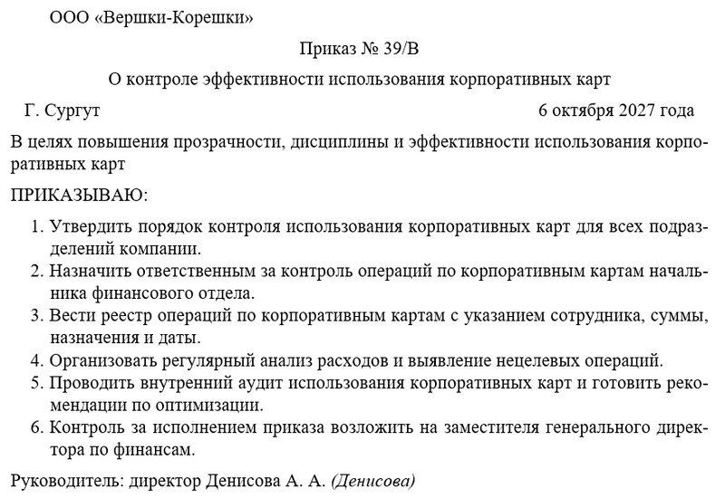 Бланк приказ о контроле эффективности использования корпоративных карт