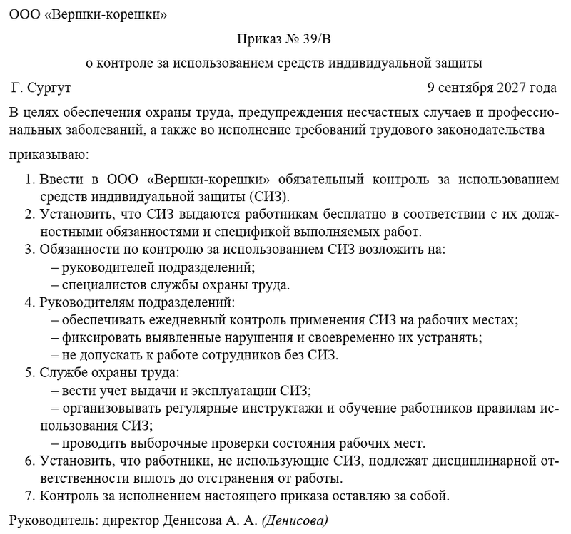 Приказ о контроле за использованием средств индивидуальной защиты должен включать несколько ключевых блоков.