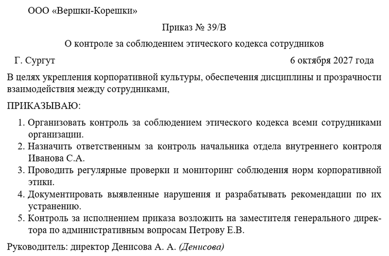 Бланк приказа о контроле за соблюдением этического кодекса сотрудников