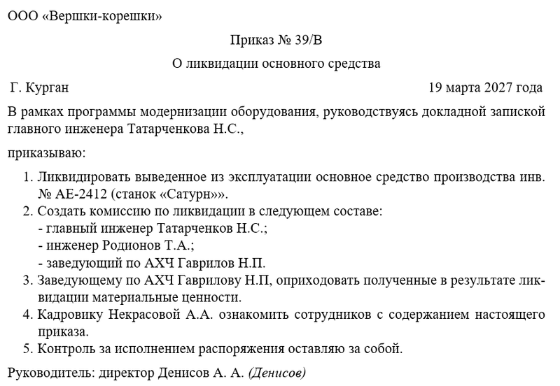 - ликвидировать выведенное из эксплуатации основное средство производства под таким-то инвентарным номером;