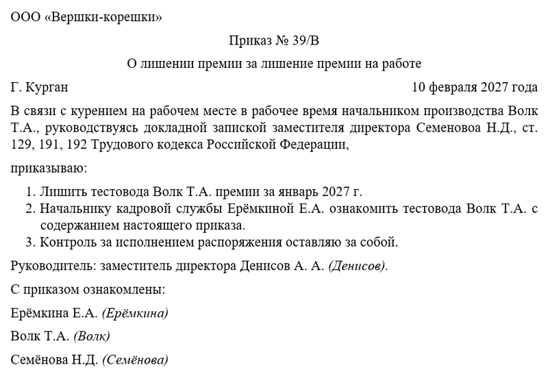 Для того чтобы официально лишить сотрудника премии, достаточно будет одного лишь факта курения на работе, однако этот факт должен быть подтвержден официально. В этих целях по факту нарушения на месте сотрудниками составляется соответствующий акт. Уже на основании акта директор и издаст своё распоряжение.