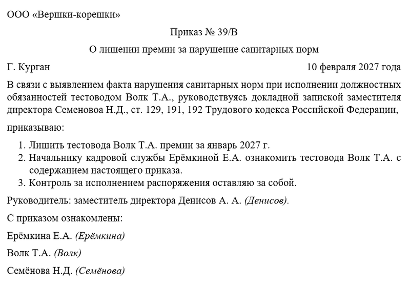 Говоря о форме приказа о лишении премии за нарушение санитарных норм, следует отметить, что по состоянию на сегодняшний день отечественный законодатель и вовсе не предлагает нам к применению каких-то конкретных бланков или шаблонов, которыми мы могли бы руководствоваться в своей работе. Отсюда получается, что единственное, на что нам следует обратить внимание, – это общие правила делового документооборота, документы схожего толка. Придерживаясь ряда относительно несложных для выполнения требований, на выходе мы получим максимально корректно оформленное распоряжение директора компании.