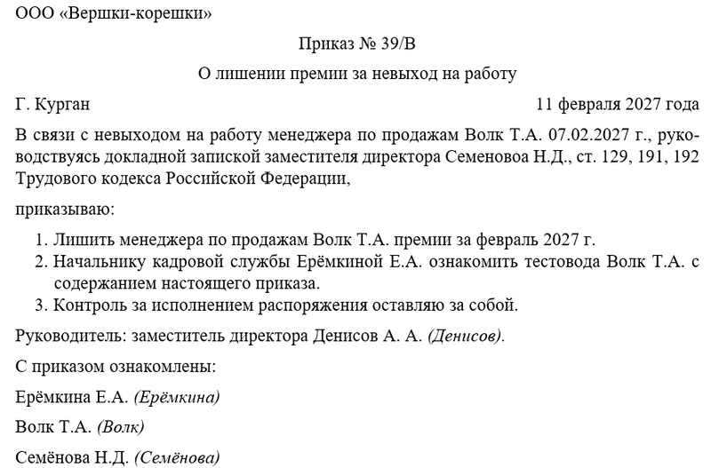 Приказ о лишении премии за невыход на работу – это распорядительный документ, в соответствии с которым руководитель компании может принять решение о невыплате своему подчинённому премиальной части заработной платы за совершенный им дисциплинарный проступок. Сегодня мы разберемся, насколько серьезным нарушением является невыход на работу, можно ли лишиться премии за подобный проступок, причем здесь распоряжение начальника и как правильно его оформить.