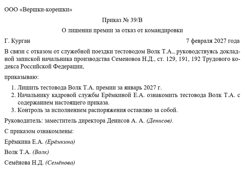 - лишить сотрудника премии за отказ от командировки;