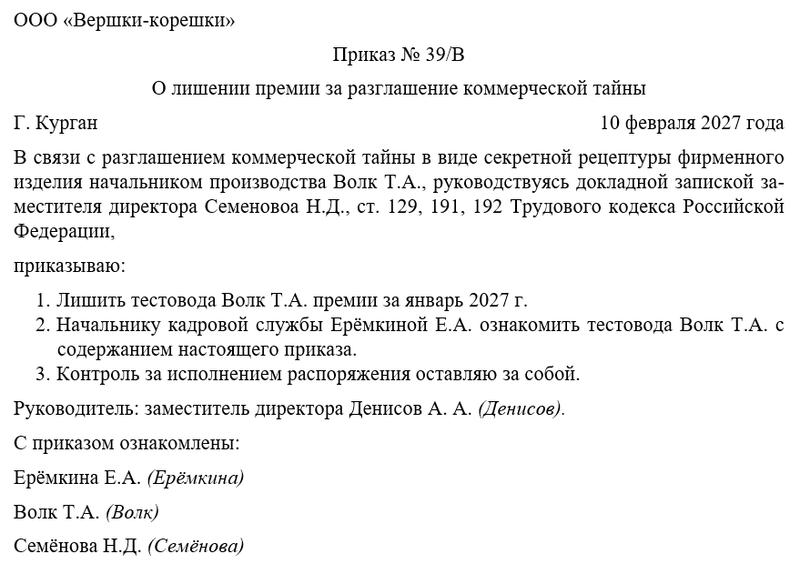 Скачать в КонсультантПлюсБесплатный доступ к документуОбразец приказа о лишении премии за разглашение коммерческой тайны