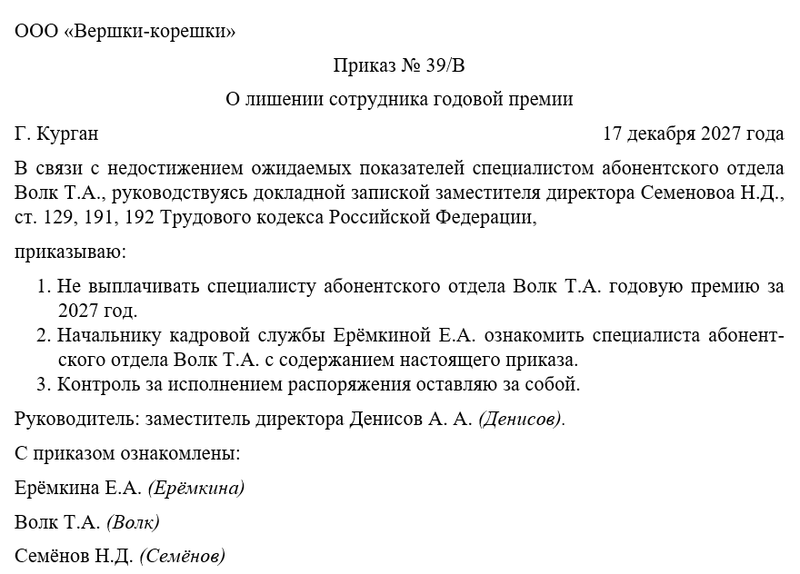 Любое распоряжение начальника должно иметь под собой достаточные основание и обоснование. Основание – это нормативная основа для принятия соответствующего решения. Конкретно в нашем случае потребуется сослаться на 129, 191 и 192 статьи Закона «О труде». Что касаемо обоснования, то здесь нужно будет ссылаться на внутренние документы, подтверждающие обстоятельства, ставшие поводом для невыплаты премии. В теории это может быть докладная записка от одного из локальных руководителей, акт о совершении того или иного дисциплинарного проступка или же что-то ещё.