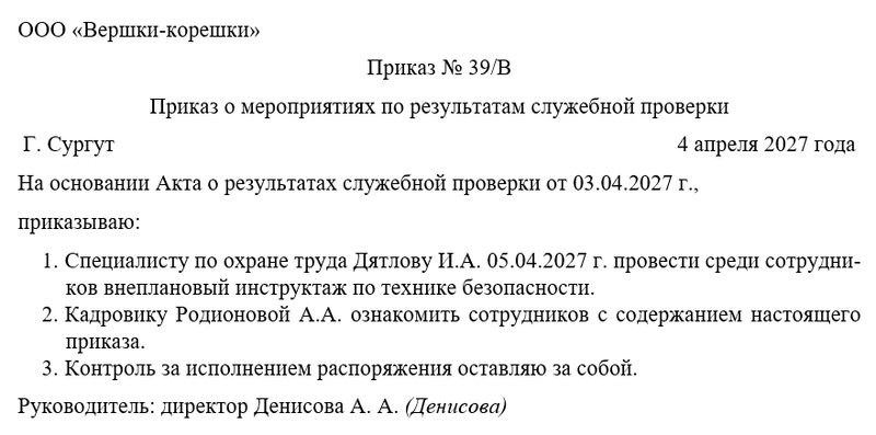 Следующим шагом руководитель объявляет о проведении мероприятий по результатам служебной проверки, а также назначает человека, который будет осуществлять контроль. Чаще всего контроль за исполнением распоряжения директор оставляет за собой.