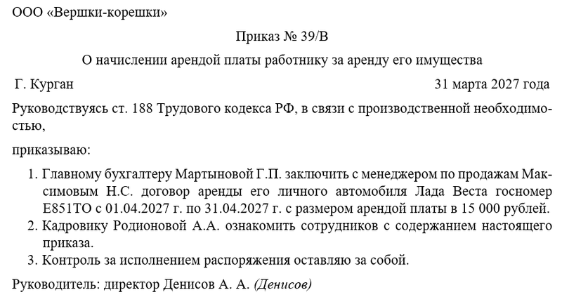 Следующим шагом руководитель объявляет о заключении с сотрудником договора аренды в отношении его личного имущества, раздает подчинённым соответствующе распоряжения, возлагает ответственность за исполнение приказа, а также назначает человека, который будет осуществлять контроль. Чаще всего контроль за исполнением распоряжения директор оставляет за собой.