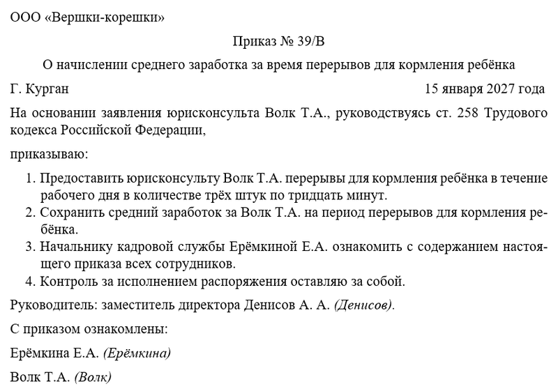 Скачать в КонсультантПлюсБесплатный доступ к документуОбразец приказа о начислении среднего заработка за время перерывов для кормления ребёнка