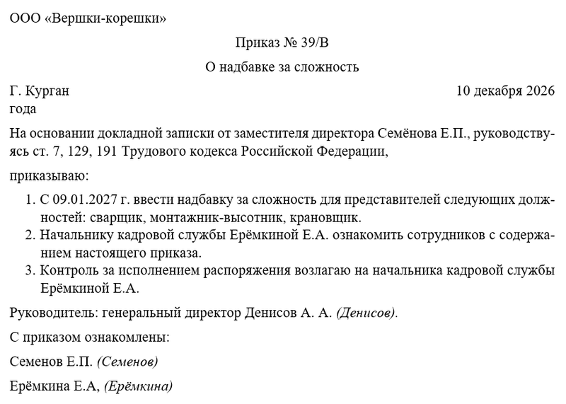 - с такого-то числа утвердить на предприятии надбавку за сложность представителям таких-то должностей;