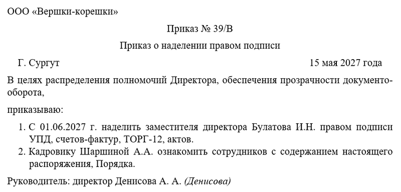 Следующим шагом руководитель объявляет о наделении правом подписи соответствующих документов одного из своих подчинённых. При необходимости делаем ссылку на решение участников общества или совета директоров. Также необходимо решить вопрос о том, кто их работников будет следить за исполнением распоряжения. Чаще всего контроль за исполнением распоряжения директор оставляет за собой.
