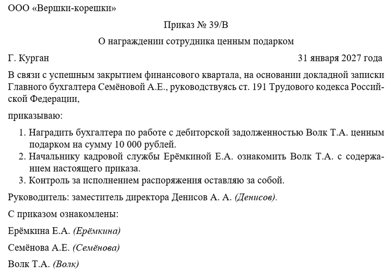 Приказ о награждении сотрудника ценным подарком – это распорядительный документ, в соответствии с котором руководитель компании может принять решение о вручении одному из своих подчинённых ценного подарка за его заслуги перед предприятием. Сегодня мы разберемся, что может подразумеваться под ценным подарком, за что он может полагаться сотруднику, зачем нужно соответствующее распоряжение начальника и как правильно его оформить.