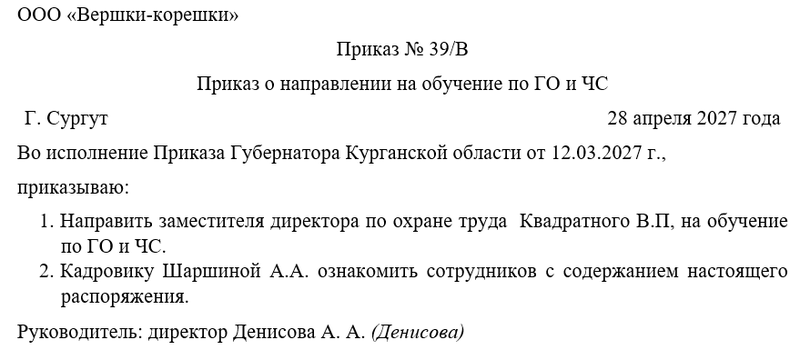 Следующим шагом руководитель объявляет о направлении на обучение по ГО и ЧС. Также необходимо решить вопрос о том, кто их работников будет следить за исполнением распоряжения. Чаще всего контроль за исполнением распоряжения директор оставляет за собой.