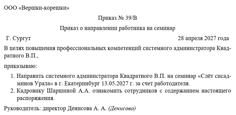 Следующим шагом руководитель объявляет о направлении кого-то из работников на семинар по той или иной теме. Также необходимо решить вопрос о том, кто их работников будет следить за исполнением распоряжения. Чаще всего контроль за исполнением распоряжения директор оставляет за собой.