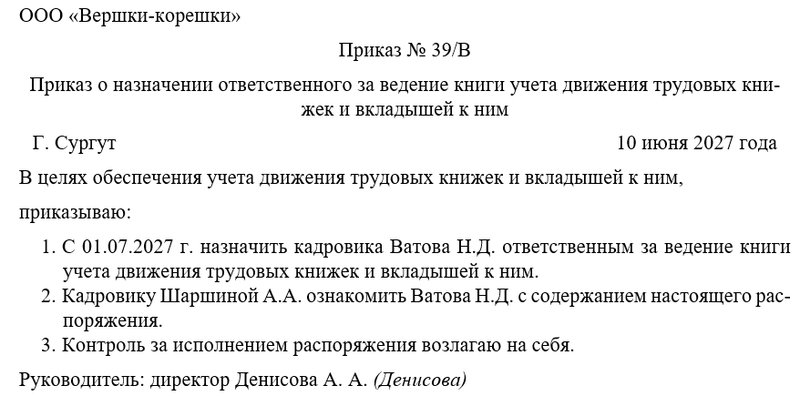 Приказ о назначении ответственного за ведение книги учета движения трудовых книжек и вкладышей к ним – это официальный документ руководителя. Он закрепляет персональную ответственность сотрудника за правильное ведение этого регистра. В рамках настоящего материала мы рассмотрим назначение книги, ответственных лиц, роль приказа, ответственность за нарушения.