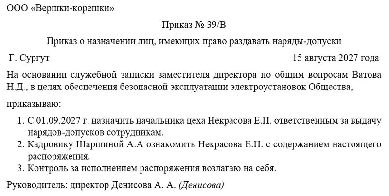 Приказ является основным юридическим основанием для предоставления сотрудникам права выдавать наряды-допуски. В нём указываются фамилии, должности и структурные подразделения назначенных работников, а также нормативные акты, на основании которых им предоставляются эти полномочия. Документ может содержать перечень видов работ, для которых действуют полномочия, и срок их действия. Приказ обеспечивает прозрачность процедуры и исключает возможность несанкционированной выдачи документов.