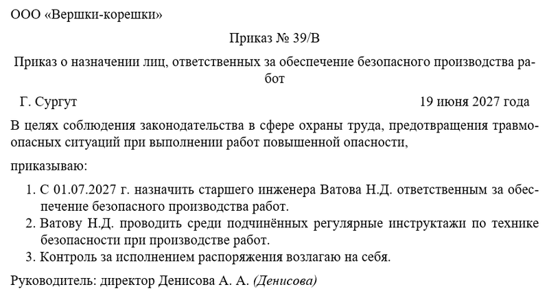 Скачать в КонсультантПлюсБесплатный доступ к документуОбразец приказа о назначении лиц, ответственных за обеспечение безопасного производства работ