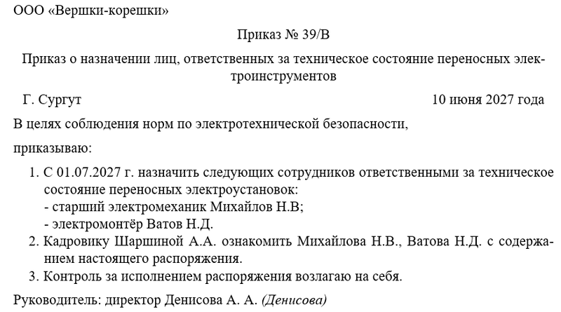 Следующим шагом директор объявляет о назначении лиц, ответственных за техническое состояние переносных электроустановок. Также необходимо решить вопрос о том, кто их работников будет следить за исполнением распоряжения. Не забудем назначить одного из сотрудников ответственным за ознакомлением с новым регламентом всех коллег. Это может быть руководитель отдела или целого направления, заместитель директора. Чаще всего контроль за исполнением распоряжения директор оставляет за собой.