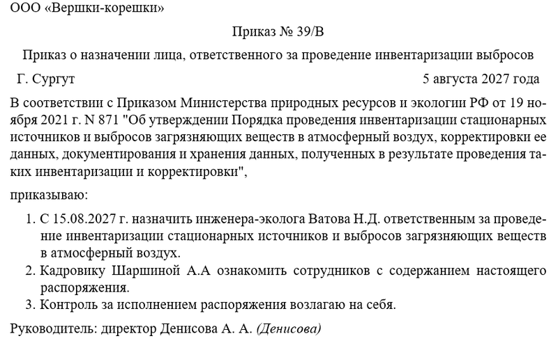 Скачать в КонсультантПлюсБесплатный доступ к документуОбразец приказа о назначении лица, ответственного за проведение инвентаризации выбросов