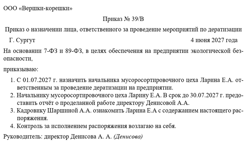 Следующим шагом директор объявляет о назначении одного из своих подчинённых ответственным за проведение мероприятий по дератизации. Также необходимо решить вопрос о том, кто их работников будет следить за исполнением распоряжения. Не забудем назначить одного из сотрудников ответственным за ознакомлением с новым регламентом всех коллег. Это может быть руководитель отдела или целого направления, заместитель директора. Чаще всего контроль за исполнением распоряжения директор оставляет за собой.