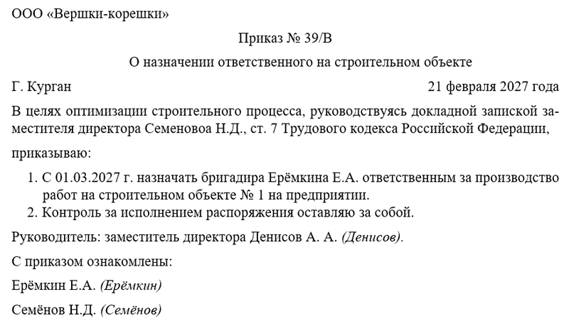 - с такого-то назначить сотрудника ответственным за проведение работ на строительном объекте;
