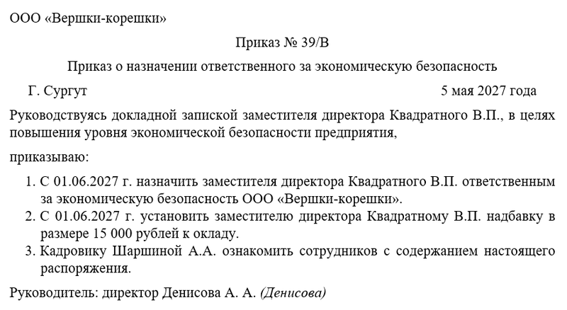 Следующим шагом руководитель объявляет о назначении одного из действующих сотрудников ответственным за экономическую безопасность предприятия. Ссылка на нормативную базу обязательна. Также необходимо решить вопрос о том, кто их работников будет следить за исполнением распоряжения. Чаще всего контроль за исполнением распоряжения директор оставляет за собой.