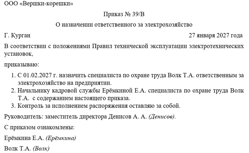 - с такого-то числа назначить такого-то сотрудника ответственным за электрохозяйство на предприятии;