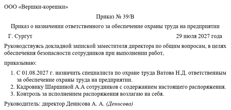 Скачать в КонсультантПлюсБесплатный доступ к документуОбразец приказа о назначении ответственного за обеспечение охраны труда на предприятии