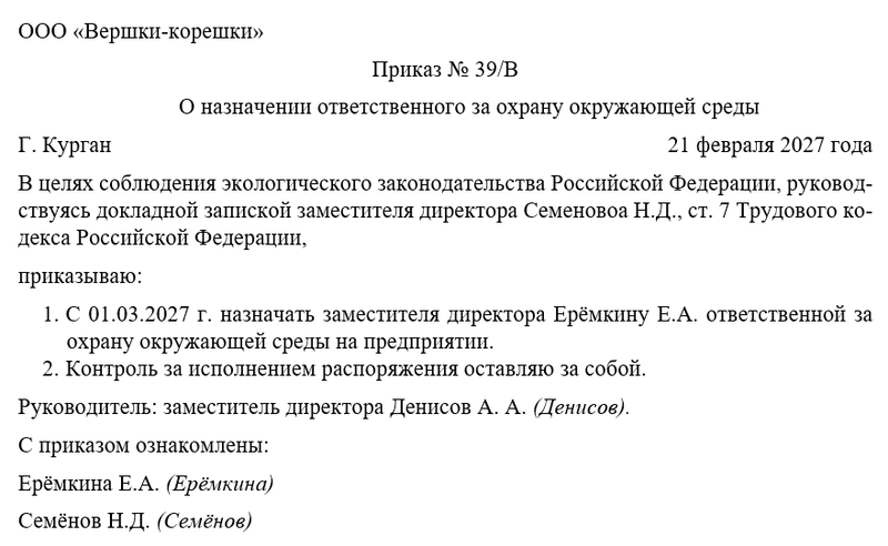 - с такого-то назначить сотрудника ответственного за охрану окружающей среды;