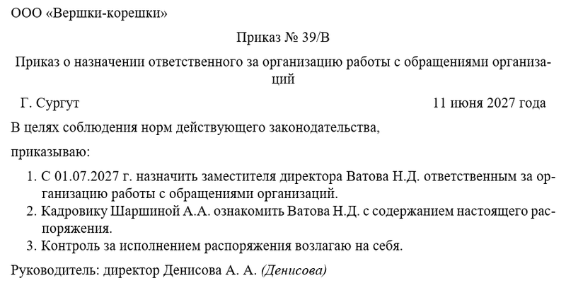 Приказ директора о назначении ответственного лица играет важную роль в организации работы с обращениями организаций. Он формализует процесс назначения, что обеспечивает четкое распределение обязанностей. Такой приказ служит внутренним документом, который может использоваться для контроля за выполнением задач и процедур обработки обращений.
