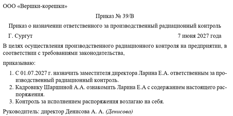 Следующим шагом директор объявляет о назначении одного из сотрудников компании ответственным за производственный радиационный контроль. Также необходимо решить вопрос о том, кто их работников будет следить за исполнением распоряжения. Не забудем назначить одного из сотрудников ответственным за ознакомлением с новым регламентом всех коллег. Это может быть руководитель отдела или целого направления, заместитель директора. Чаще всего контроль за исполнением распоряжения директор оставляет за собой.