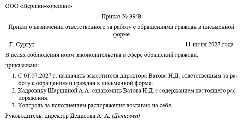 Приказ директора о назначении ответственного лица играет ключевую роль в организации работы с обращениями граждан. Он формализует процесс назначения, что способствует установлению четкой ответственности.