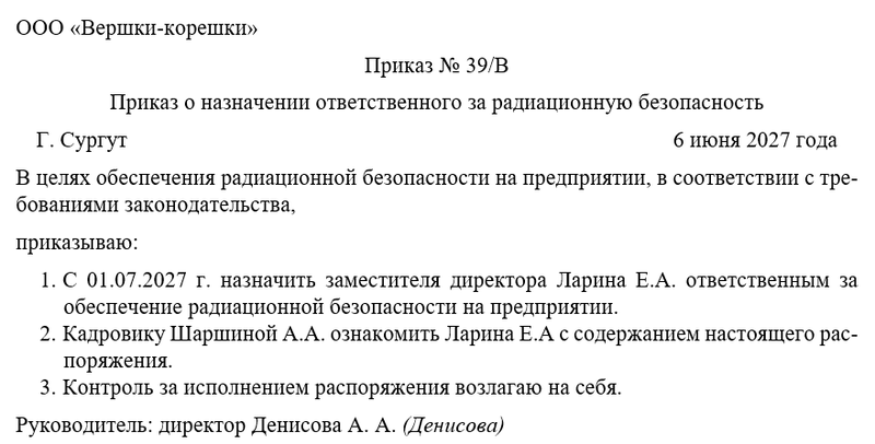 Следующим шагом директор объявляет о назначении одного из сотрудников компании ответственным за радиационную безопасность на предприятии. Также необходимо решить вопрос о том, кто их работников будет следить за исполнением распоряжения. Не забудем назначить одного из сотрудников ответственным за ознакомлением с новым регламентом всех коллег. Это может быть руководитель отдела или целого направления, заместитель директора. Чаще всего контроль за исполнением распоряжения директор оставляет за собой.