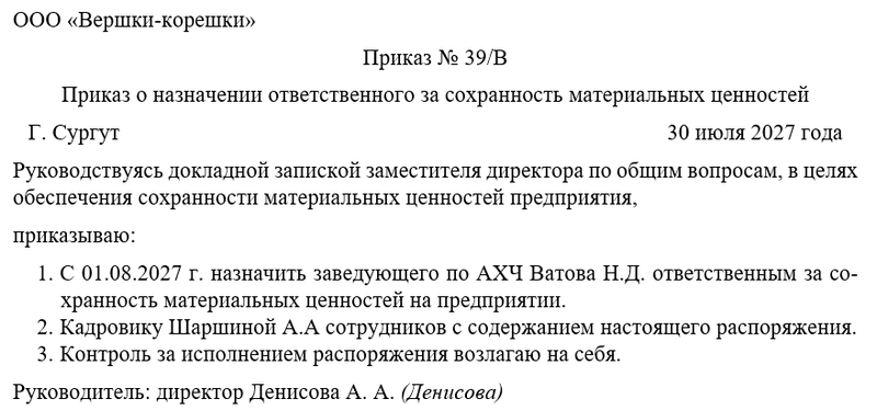 Скачать в КонсультантПлюсБесплатный доступ к документуОбразец приказа о назначении ответственного за сохранность материальных ценностей