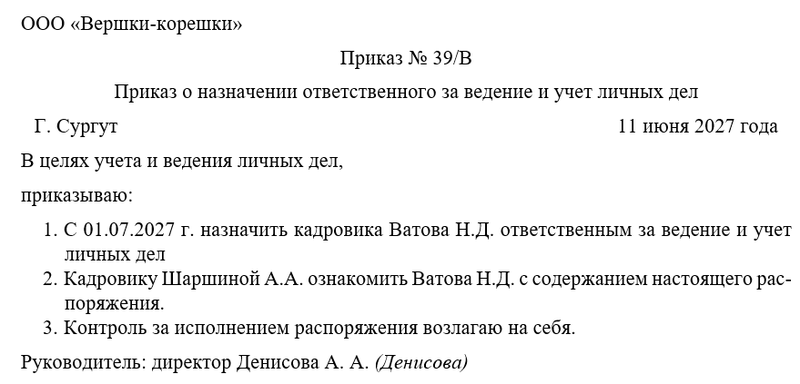 Скачать в КонсультантПлюсБесплатный доступ к документуОбразец приказа о назначении ответственного за ведение и учет личных дел